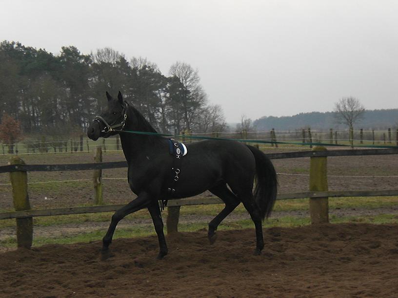 Der 3 jährige Hengst Lamorac zeigt sich von Anfang an routiniert an der Longe ( hier beim ersten Mal ! ) und inzwischen auch unter dem Sattel von Amelie - ( fast so ) abgeklärt wie ein Alter ! Drücken wir ihnen allen für die Zukunft die Daumen !