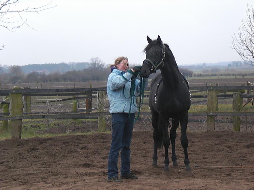 Halbbruder Lamorac von Invincible Sir ( Trak. ) wird zum allerersten Longieren vorbereitet - Amelie ganz in ihrem Element und sehr konzentriert. Lamorac eher neugierig !