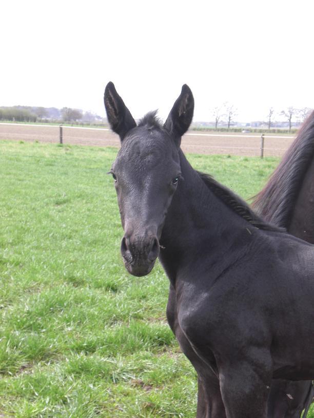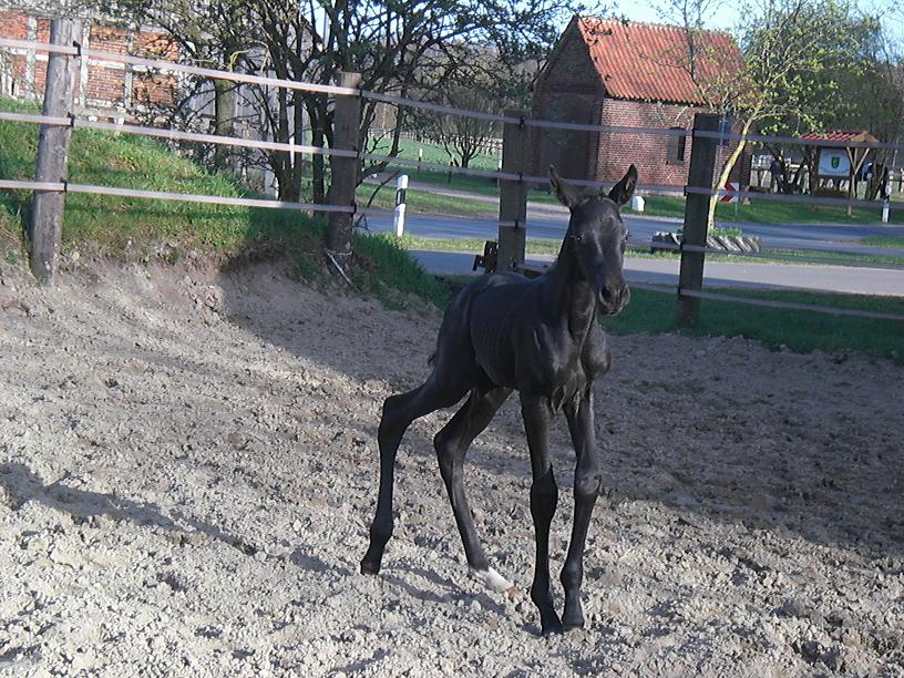 geb. am 8.April , Vater ist der Trakehner Reservesiegerhengst All Inclusive von Gribaldi, die Mutter ist unsere Lärche xx. Hier ist das kleine Pferdekind 2 Tage alt ! Lackschwarz wie die Mama und sooo lange Beine - die müssen erst mal sortiert werden! Auch die Mama Lärche xx, immerhin 23 Jahre alt, hat die Geburt hervorragend überstanden.