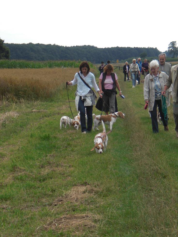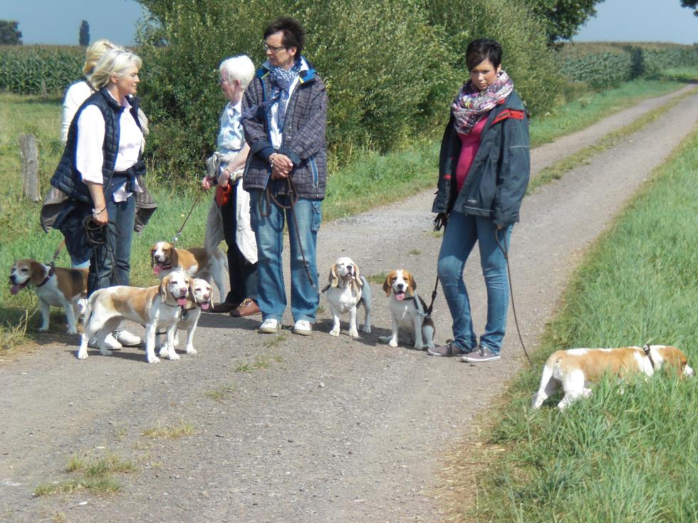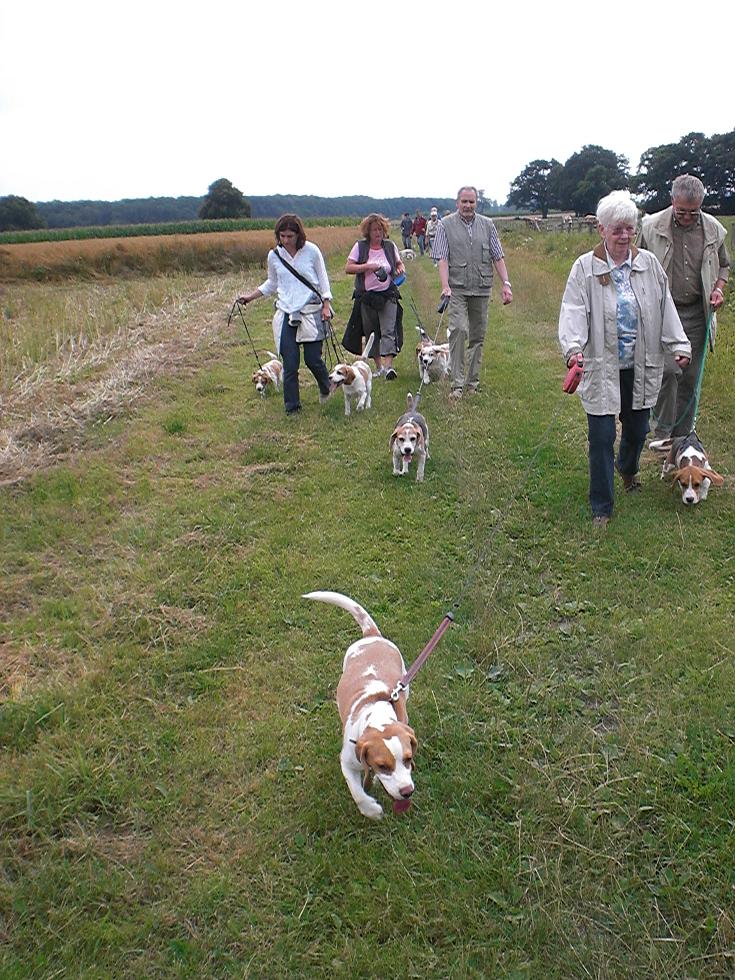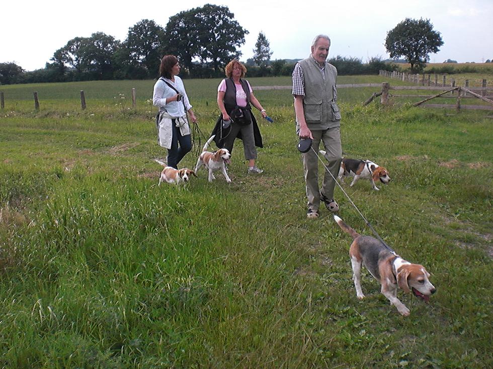 Sekt, Mittagessen und Kaffeetrinken wurde durch Spaziergänge unterbrochen - die Hunde konnten über die Stoppelfelder toben, einer gab immer den “Hasen” ! Und klönen und fachsimpeln können Beaglebesitzer auch bei flotterem Tempo! Schreckminuten gab es, als Lawrie meinte, den morgentlichen Spaziergang wiederholen zu müssen und einfach geradeaus preschte, Jung und Alt ohne Leine mit Begeisterung hinterher! Gegen den Wind zu rufen war schwierig, aber er merkte dann doch schnell, daß die 2-Beiner fehlten und kam genanuso schnell zurückgesaust, alle anderen hinterher!