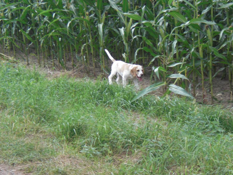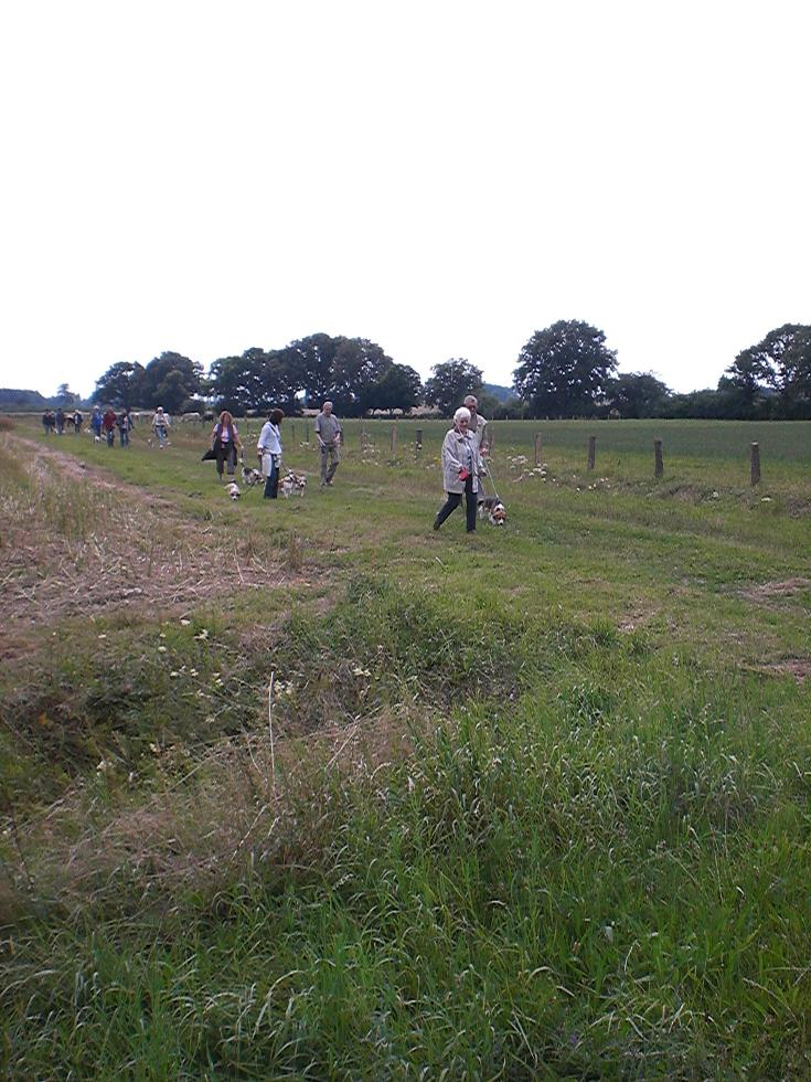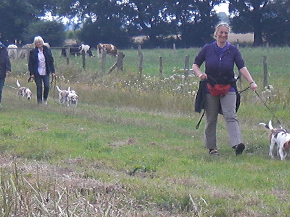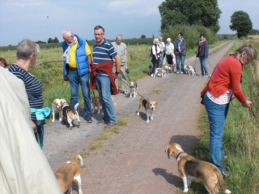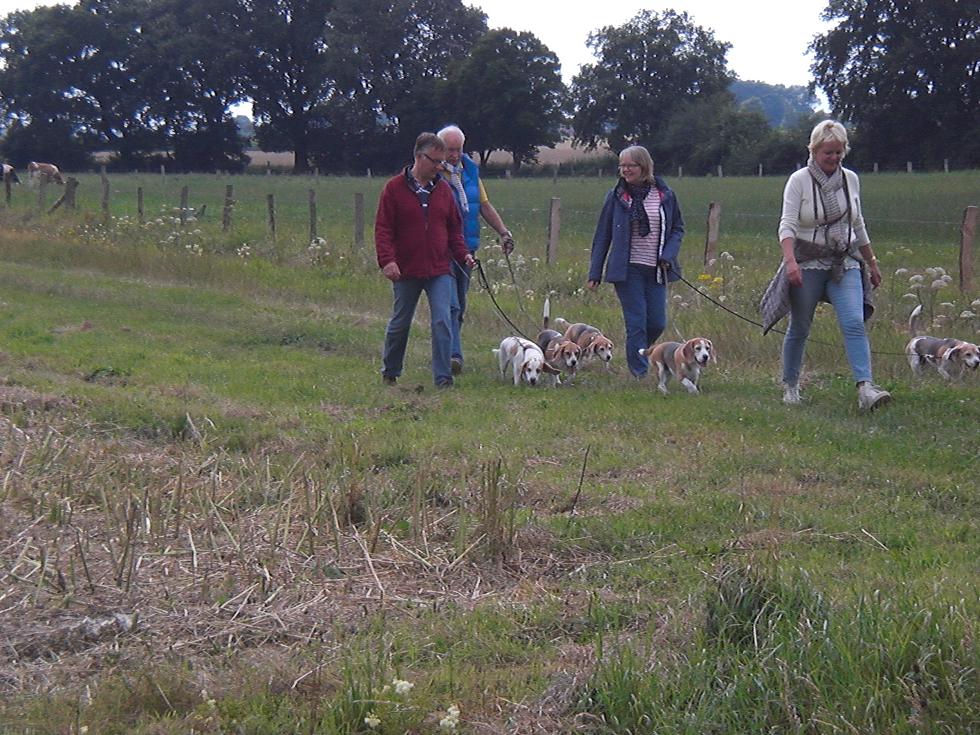 Sekt, Mittagessen und Kaffeetrinken wurde durch Spaziergänge unterbrochen - die Hunde konnten über die Stoppelfelder toben, einer gab immer den “Hasen” ! Und klönen und fachsimpeln können Beaglebesitzer auch bei flotterem Tempo! Schreckminuten gab es, als Lawrie meinte, den morgentlichen Spaziergang wiederholen zu müssen und einfach geradeaus preschte, Jung und Alt ohne Leine mit Begeisterung hinterher! Gegen den Wind zu rufen war schwierig, aber er merkte dann doch schnell, daß die 2-Beiner fehlten und kam genanuso schnell zurückgesaust, alle anderen hinterher!