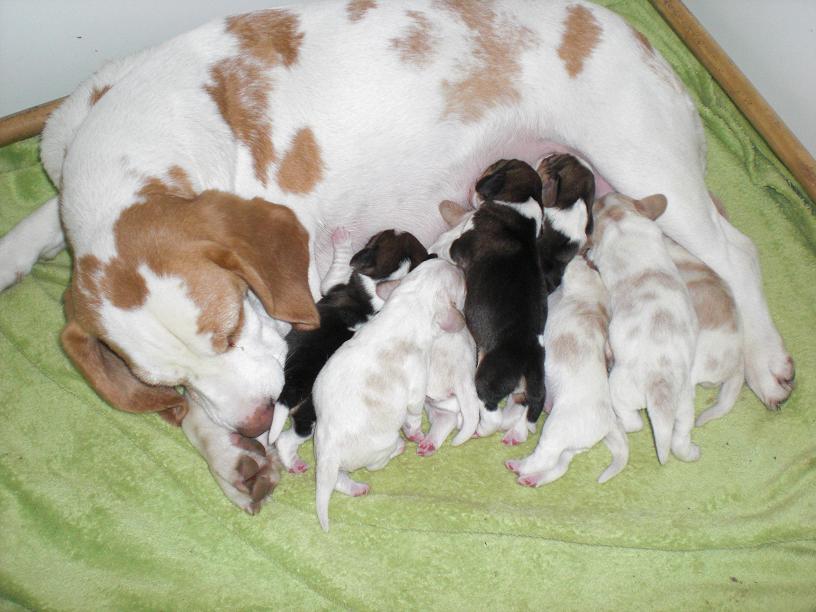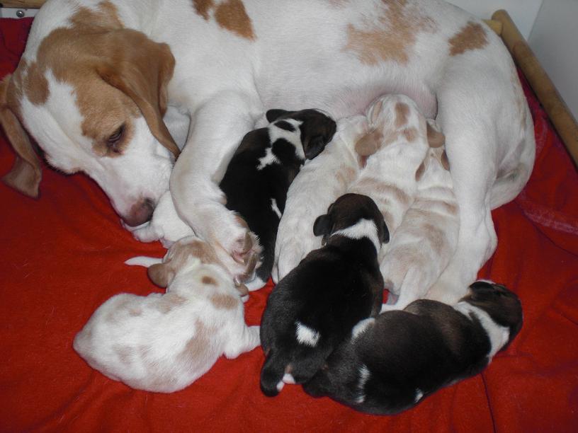 Was für ein Gedränge ! Aber nur für kurze Zeit, dann hat Nettle wieder alles passend “sortiert” - die einer Hälfte trinkt, die anderen liegen geborgen zwischen den Vorderläufen, eine tolle Mutter, meine kleine Nettle ! Ich bin sehr stolz auf sie und es ist sehr beruhigend, eine so zuverlässige Hündin zu haben. Die Welpen haben schon gut zugenommen und sind sehr zufrieden und ruhig. Wenn Sie nachzählen möchten - es sind wirklich 8 kleine bunte Hunde !