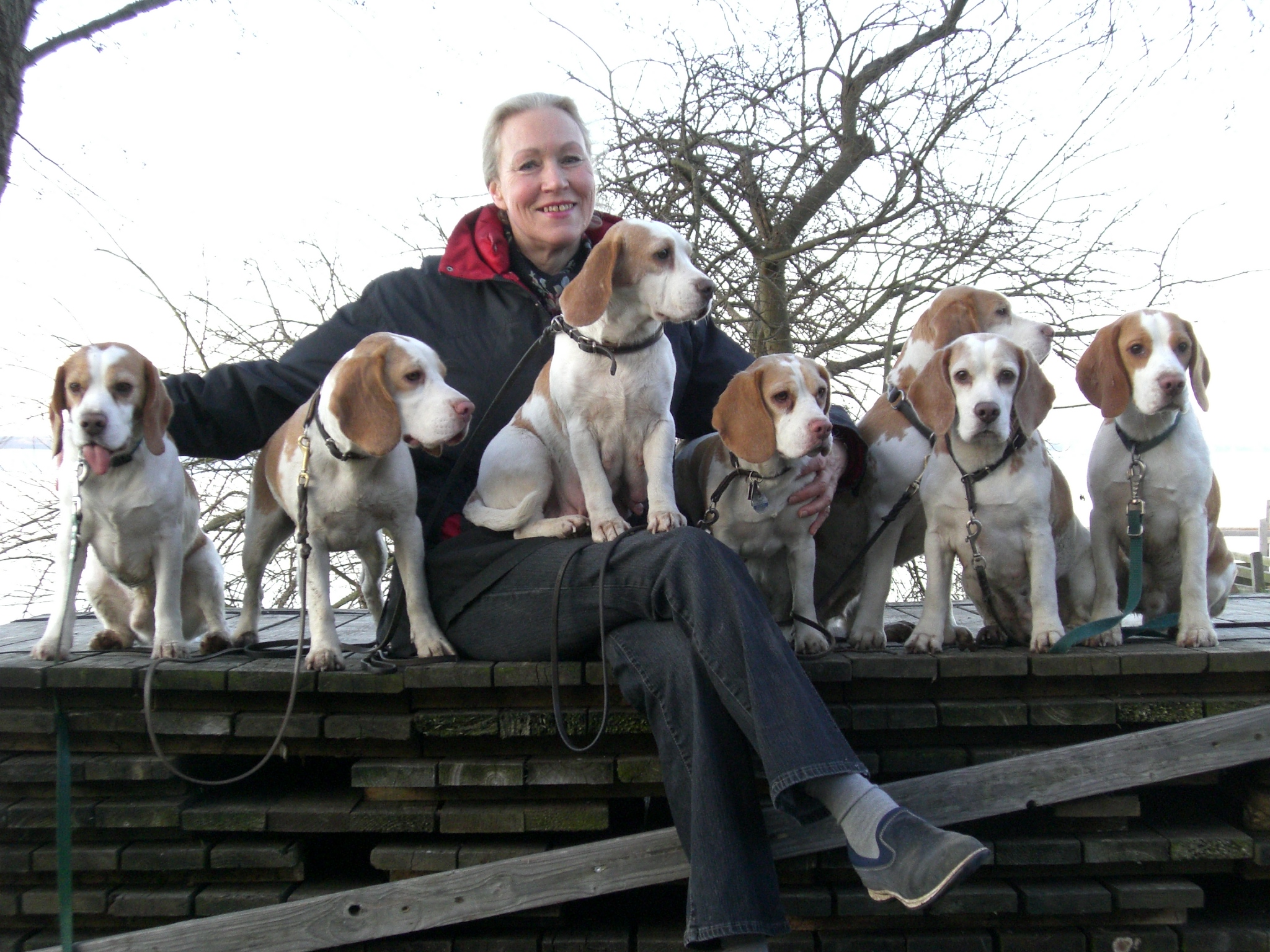 Um es ein bißchen leichter zu machen: Die Hunde sind alle zweifarbig und verteilen sich auf drei Besitzer; außen sitzt jeweils ein Rüde.