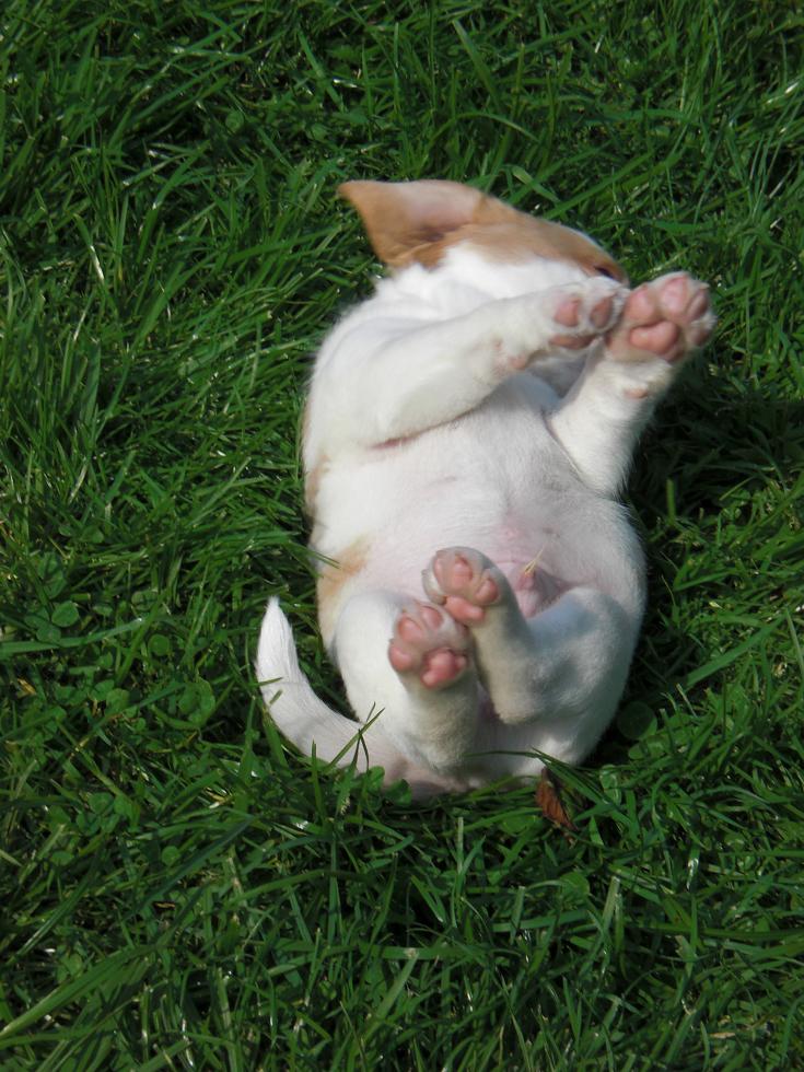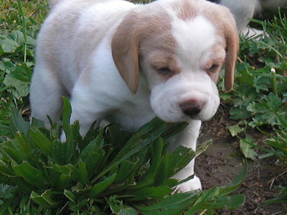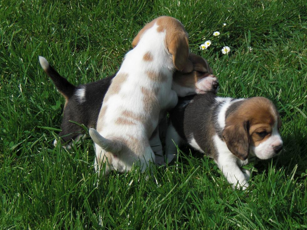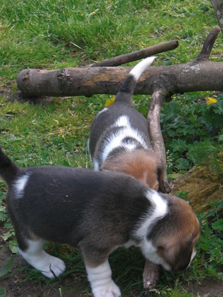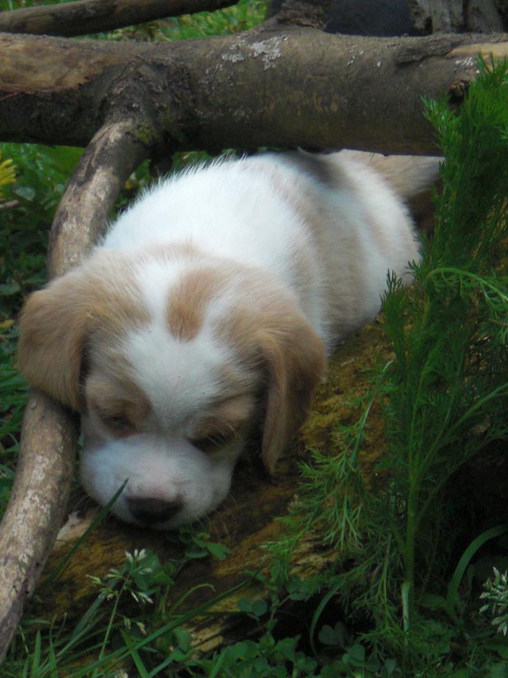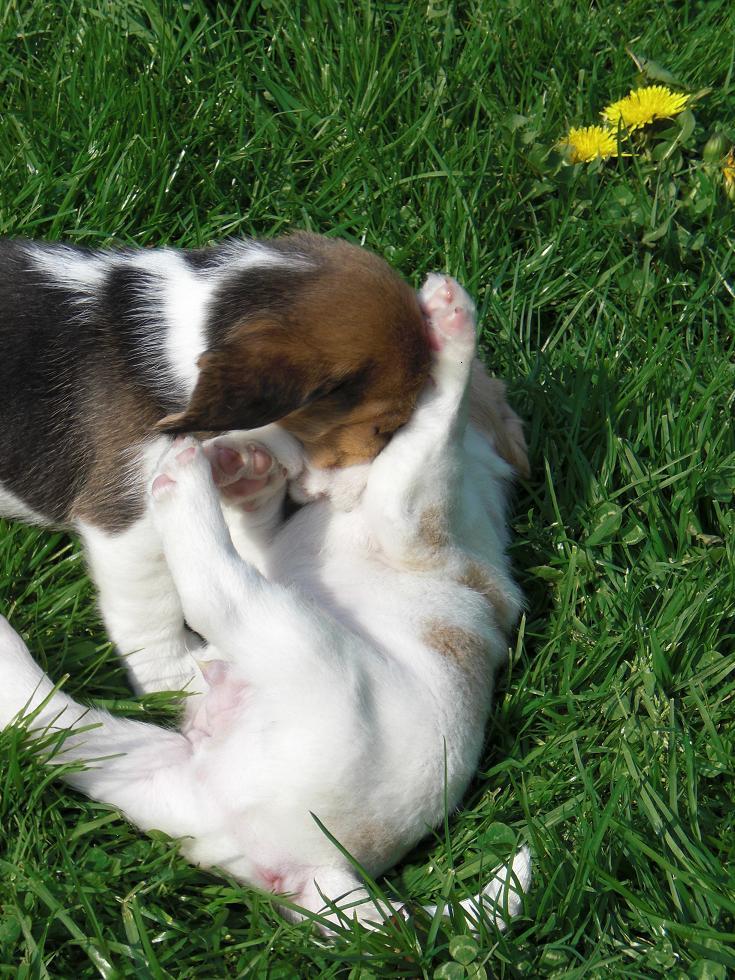 Die Welpen sind jetzt - mit 4 1/2 Wochen - in die Küche umgezogen und können von ihrem Welpenauslauf mit den Pipizeitungen ( klappt super !!! ) tagsüber selbstständig in den Hundegarten tapsen. Und der Hundegarten ist für die Kleinen der schönste Abenteuerspielplatz - mit einem alten Baumstamm, dicken Ästen, schon gebuddelten Löchern und Gras und Löwenzahn und Gänseblümchen. Kein englischer Lawn und auch die Küche ist kein “Showroom”… aber die Hunde sind glücklich!