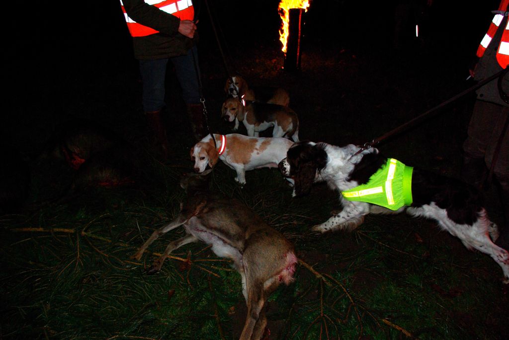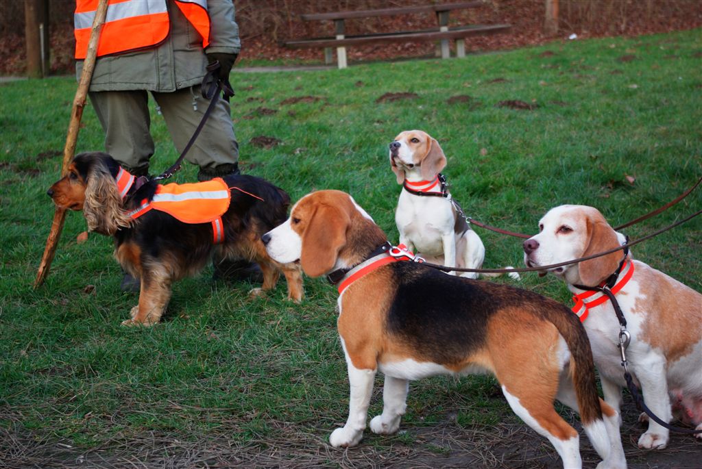Diese Einladung verdankten wir dem ( verbotenen ) Hasenjagen von Bluebelle. Als ein Hase direkt vor ihrer Nase hochging, konnte sie -trotz ihrer guten Erziehung - nicht widerstehen und arbeitete sauber mit sicherem Spurlaut. Ein im Auto vorbeifahrende Jäger sprach Frau Hoefft an, die sich als erstes vielmals entschuldigte - aber darum ging es garnicht ! Der Herr war so begeistert von Bluebelles Arbeit, daß er sie spontan zu seiner nächsten Drückjagd einlud ( … so eine tolle Arbeit habe er selten gesehen !) und es könnten gerne noch mehr Beagles mitkommen.