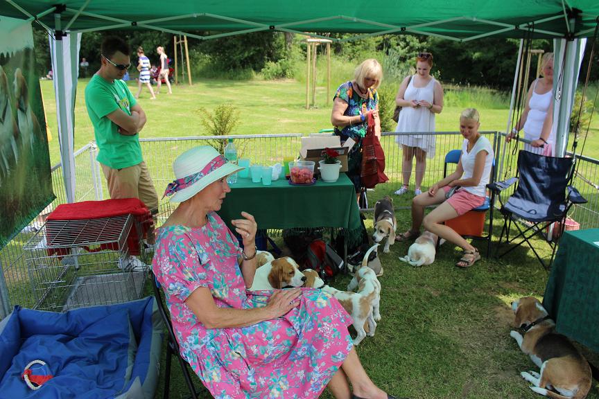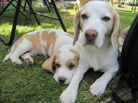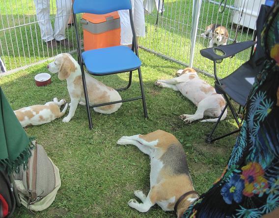 2 x täglich konnten wir auf der großen Teichwiese unsere Rassen und ihre Arbeit vorstellen. Auch hierbei hörte ein großes Publikum sehr interessiert zu. Unser Stand war ständig dichtig umlagert ( ganz ehrlich: er war die Attraktion unter den Hundeständen… ), es wurde gestreichelt, gefragt und Erfahrungen ausgetauscht und die Flyer des BCD über die Rasse waren schon am Mittag des letzten Tages alle verteilt! Am Sonntag und Montag konnten wir eindrucksvoll demonstrieren, dass Beagle eben nicht dumm und unerziehbar und auch zu ernsthafter Arbeit in der Lage sind - nicht nur zum Weglaufen hinter Hasen her: während Frau Baumann mit ihrer 7 jährigen Wilma demonstrierte, dass ein Beagle nicht nur Sitz und Platz sondern auch Rolle, Kriechen und vieles mehr lernen kann, zeigte Klein-Seyton mit seinen 11 Wochen, dass in dem jugendlichen Alter schon der erste Grundgehorsam sicher erlernt sein kann - und Rolle kann er auch schon fast ! ..Seyton und Wilma: Entspannung nach getaner Arbeit im schattigen Zelt. Am Montag zeigte Frau Hoefft mit Bluebelle und Floribel den “normalen” Haushundegehorsam mit getrenntem Ablegen und Heranrufen. Ein besonderer Höhepunkt war sicherlich das Mantrailing, daß Franziska Rogge mit ihrer New Impression’s Lucy demonstrierte: trotz Schafschur, Poloponies, Apport der Retriever, Oldtimern und vielen Menschen fand sie ihre Zielperson jeweils sehr souverän - es gab großen Applaus für alle Beagle und ihre Führer !
