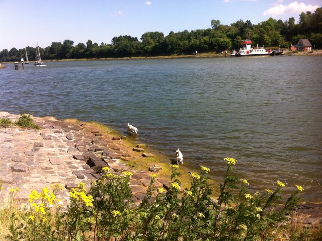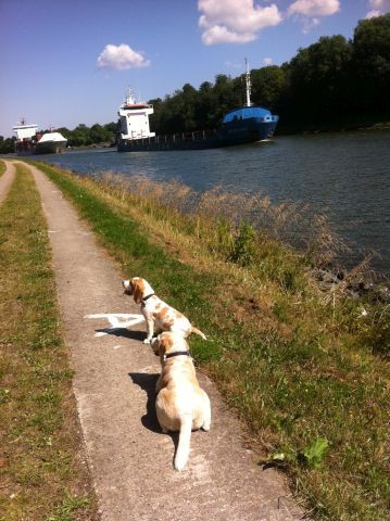 Leider sind die Temperaturen hier immer noch so hoch, das die Spaziergänge aus Rücksicht auf beide doch eher kurz ausfallen müssen. Ein Highlight jedoch immer die Fahrt zum Nord-Ostsee-Kanal. Auch diese Woche waren wir dort und Simeon ist zum ersten Mal mit der Fähre - nicht im Auto, sondern zu Fuß - gefahren. Auf dem Wirtschaftsweg entlang des Kanals können die beiden ohne Leine laufen, denn auf der einen Seite ist der Kanal und auf der andern Seite meistens eine steile Böschung. Außerdem sollten beiden mal im Kanal baden, denn das Wasser ist sehr sauber. Sie sind jedoch nicht über ein Fußbad hinaus gekommen.