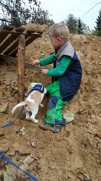 und seine neuen Freunde: er hat das Glück, vom Land auf’s Land zu ziehen und kann entsprechend mit seinem 2-beinigen Kumpel Erdhaufen erklettern