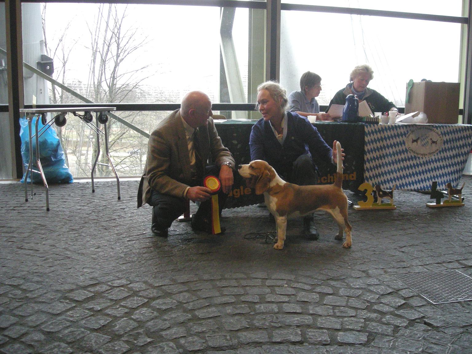 Sonntagnacht (2.März) bin ich mit Violet nach München gefahren um noch eine von den nötigen Zuchtzulassungsbewertungen zu bekommen. Bei Dunkelheit, Regen und Sturm haben wir uns gen Süden durchgekämpft. In München angekommen, mussten wir erst mal ein ruhiges Plätzchen in den engen Gängen finden. Da wir recht spät dran waren, blieb nur ein Platz in der ersten Reihe