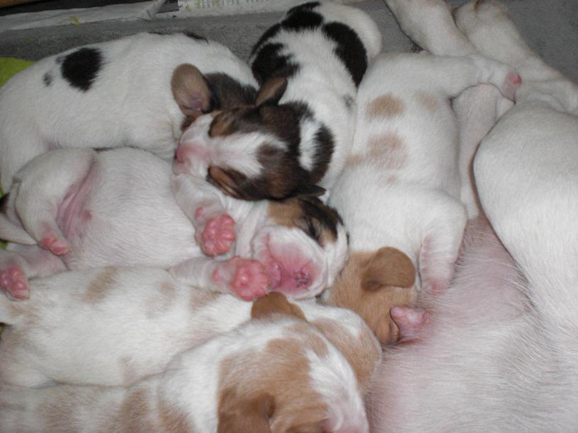24.März: Heute sind sie 10 Tage alt, die kunterbunten Welpen und sie haben sichprächtig entwickelt - tägliche Zunahmen bis zu 50 g sind die Regel! Klein-Rosie wird jetzt im 2-Stunden Rhythmus gefüttert ( das findet sie natürlich sehr gut!