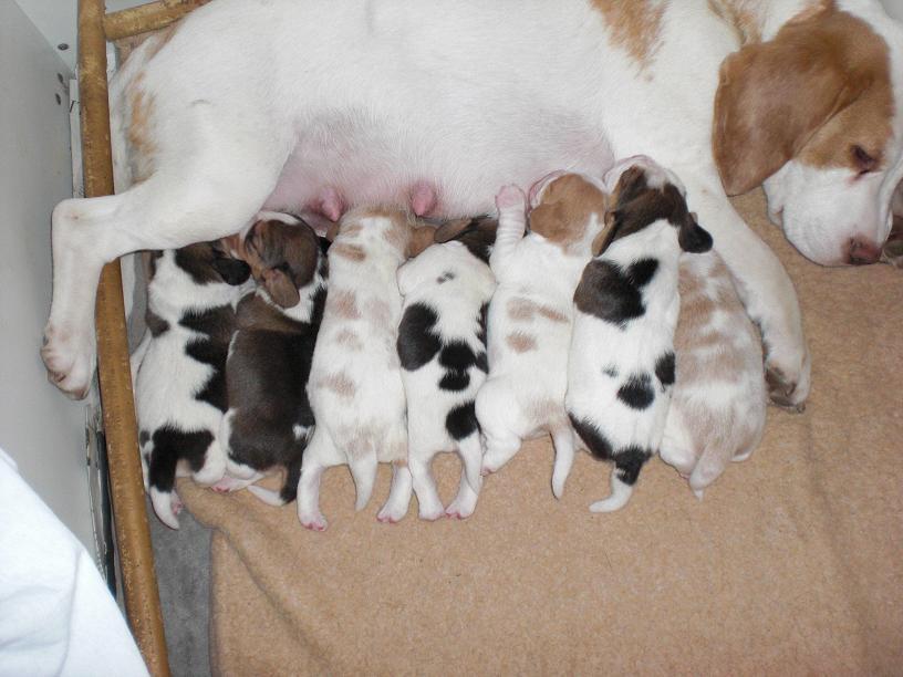 Und hier ist die bunte Hundeschar: 1 /3 tricolour und 2/1 tan/white die kleinen “U-3-s ” ! Immer wieder ein Geschenk und eine Freude, auch nach über 40 Jahren Beaglewelpen.