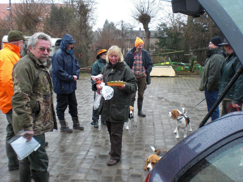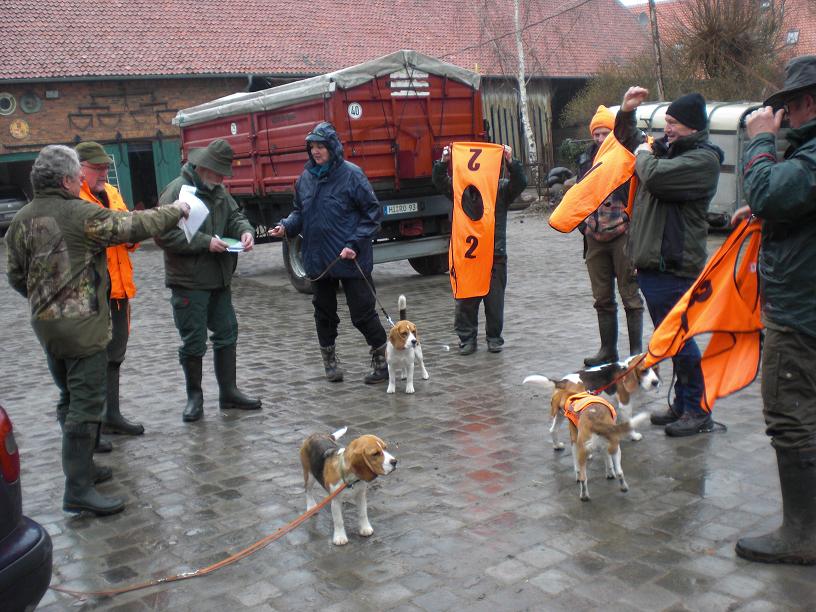 Rupert mit Führer Herrn Moelm und Klein-Tess mit mir machten sich am Frühlingsanfang auf nach Schellerten, wo wieder einmal eine Spl-Prüfung unter der Organisation von Frau Hoefft ( dicken Dank, lieber Gunda! ) in den Revier von Herrn Ohlms stattfinden durfte. Ein bewährtes Richterteam war vor Ort ( die Herren Klein, Werner und Engelking ) dazu die anderen Prüflinge Ole vom Wulbecktal ( H. Rockahr ) und Frida v. Rekka’s Hozhütte ( Herr Hensel ). Nach völlig unproblematischer Schußfestigkeitsprüfung ging es in das Revier. Das Wetter war wenig frühlingshaft, Nieselregen, kalt, ungemütlich - das führte allerdings dazu, das die Hasen fest saßen und gut gearbeitet werden konnten. Denn je freundlicher das Wetter wurde, in desto größer Zahl tummelten sich die Hasen in Gruppen bis zu 7 Stück im gut übersichtlichen Gelände - Frühling eben… - aber für die Hunde nicht zu arbeiten. Trotzdem kamen alle Hund zu ihren Recht ( die Richter waren sehr sehr freundlich und bestatteten bis zu 5 Hasen…) und so stand zur Mittagszeit fest: alle Hunde haben bestanden! Der Tagessieg mit 100 Pkt. ging an Frida ,, Interim’s Lady Tess Tuberville ( 7 Monate jung ) 100 Pkte, Interim’s Sir Rupert Rhys - 96 Pkt. und Ole vom Wulbecktal 50 Pkt.Herzlichen Glückwunsch an Hunde und Führer und Dank an Richter, Revierinhaber und Gunda!
