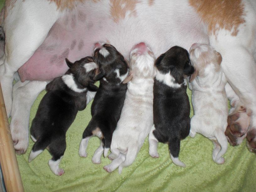 sind am 24.März zur Welt gekommen - diesmal hat sie ihre 63 Tage Trächtigkeit wirklich ausgeschöpft und uns sehr auf die Folter gespannt! Dann ging es aber ganz schnell und völlig unproblematisch und am Morgen des 24.März lagen 5 Welpoen im “Nest”: 1 / 2 tricolour und 1 / 1 tan/white, kräftig und sehr vital. Mama Heather hatte das mal eben so erledigt, wie eben so ihre Art ist… Am Montagnachmittag war sie noch beleidigt,daß ich sie nicht zum fahrradfahren mitgenommen habe !