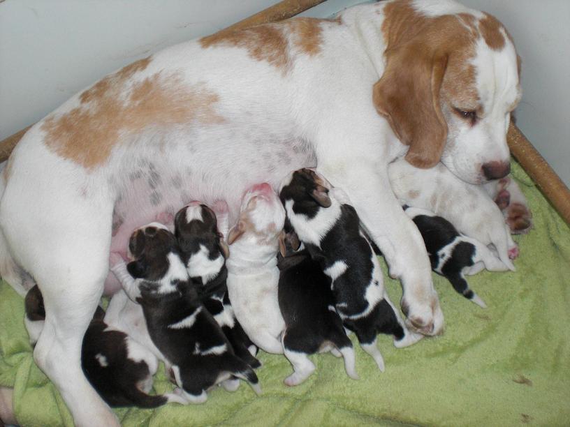 Die Wurfkiste stand natürlich schon lange bereit, als Nettle sich entschloß, ihre Welpen “mal eben so” zur Welt zu bringen: in den frühen Nachtstunden des 26. August kamen ihre 8 Beagle-inis zur Welt: 3 Jungs, 2 davon tan/white und 5 Mädels - alle mit schön viel Weiß gezeichnet. Alle sehr vital mit guten Gewichten, sind Mutter und Kinder wohlauf. Nettle besteht schon darauf, zu den kürzeren Spaziergängen mitgenommen zu werden - mal will ja fit bleiben ! Die Welpen nehmen gut zu, werden von der tollen Nettle rundum gut versorgt und entwickeln sich weiter prächtig.Wir sind sehr glücklich, solch tolle Zuchthündinnen zu haben - danke, Nettle ( und Heather und Rosie - Euch wollen wir auch nicht vergessen! ) Vater der Welpen ist Interim’s Sir Rupert Rhys ( Bes. Moelm, Bad Salzuflen )