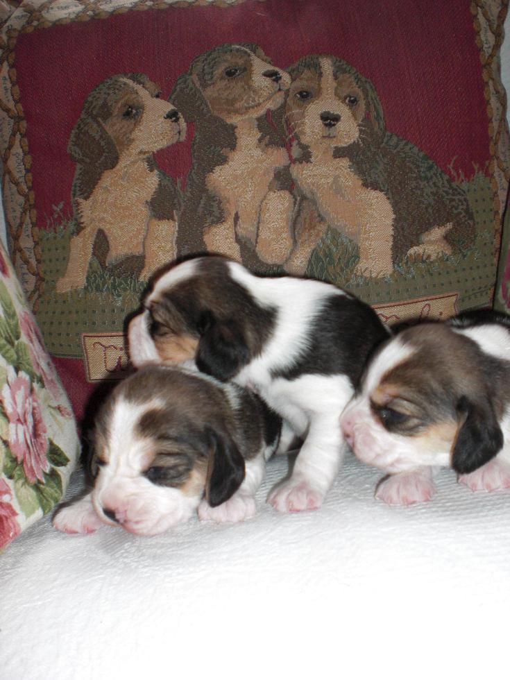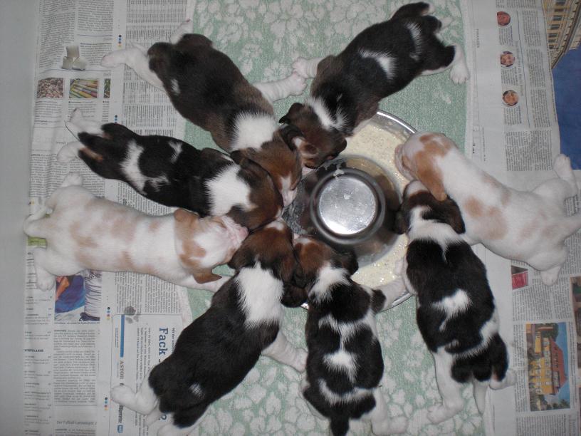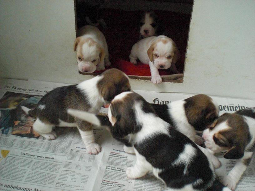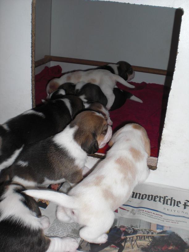Augen auf ! - zumindest bei den Mädels, die Jungs sind ja immer etwas langsamer… Das erste Mal entwurmt, Krallengeschnitten, jeden Tag ordentlich zugenommen - wartet’s ab, es dauert nicht lange, dann wird aus uns Beagle-inis eine muntere kleine Rasselbande ! Aber zunächst begnügen wir uns mit Trinken, Schlafen und den allerersten Steh-und Gehversuchen…