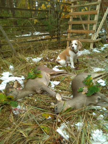 Wie du ja schon bei Facebook gesehen hast, konnte ich am Freitag ein ordentliches Stück Schwarzwild zur Strecke bringen, das sich dank der hervorragenden Arbeit von Jenkins bereits fachmännisch zerlegt im Tiefkühlschrank befindet. Das situationsbedingt etwas verschwommene Foto beweist, dass Beagles durchaus keine Berührungsängste haben, wenn es um die Sau geht! Doch damit nicht Genug! Am Samstag hatten wir revierintern eine kleine Drückjagd angesetzt. Nach kurzem Hadern entschied ich kurzerhand, den Hund trotz der niedrigen Temperaturen mit zum Sitz zu nehmen. Eingemümmelt in zwei Decken harrte er lautlos unter dem Drückjagdbock aus, was mir wiederum ermöglichte, auf kurze Distanz zwei Ricken zu strecken.![]()
