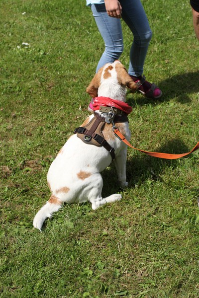 unser kleiner “Superstar” Xanthe/Paula nicht nur im Gehorsam, auch im Mantrailing mit Führerin Frau Pengel ganz prima - hier ist das Arbeitsgeschirr angelegt, letzte Konzentration und los geht’s!