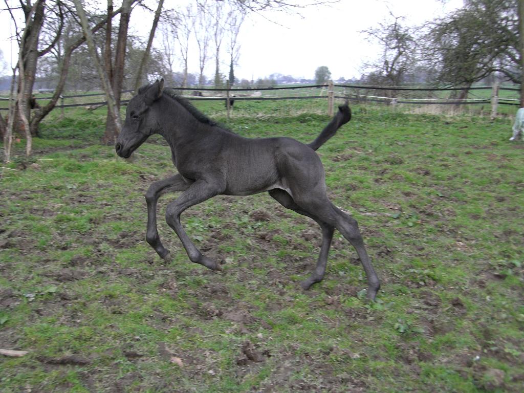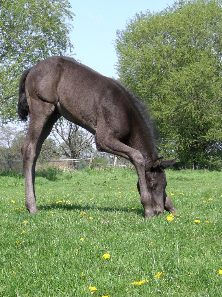 Am 4.4.2008 wurde Lamorac geboren und sprang noch am gleichen Tag das erste Mal neben seiner Mutter Lärche xx über die Weide. Inzwischen sind die Beine noch länger geworden und Lamorac muss sich ganz schön mühen, an das erste Gras zu kommen !