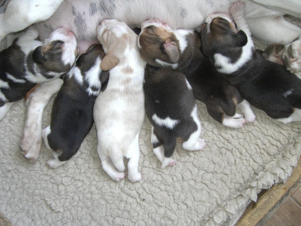 Am 8. Juni hat Violet ihren ersten Wurf in Deutschland zur Welt gebracht. 2 Rüden und 4 Hündinnen, alle gesund, munter und dank ihrer erfahrenen Mutter gut versorgt und immer zufrieden ! Ein paar Tage alt, sahehen sie so aus: die beiden Rüden links ( Higgings und Henley) dann die Mädels mit Heather, Heaven , Hope und Honour.