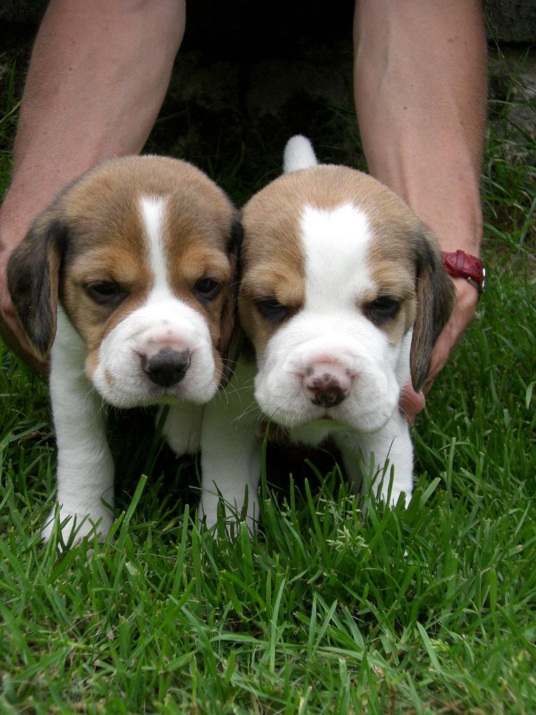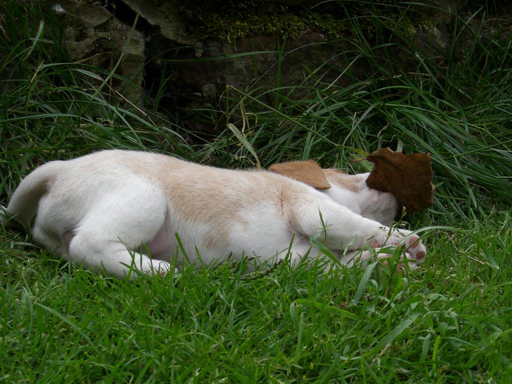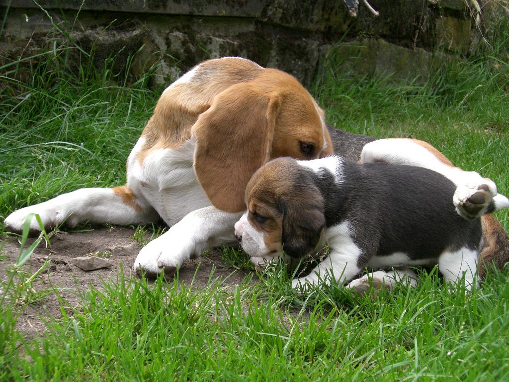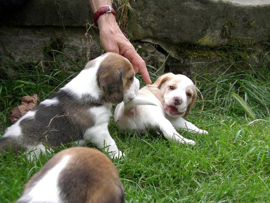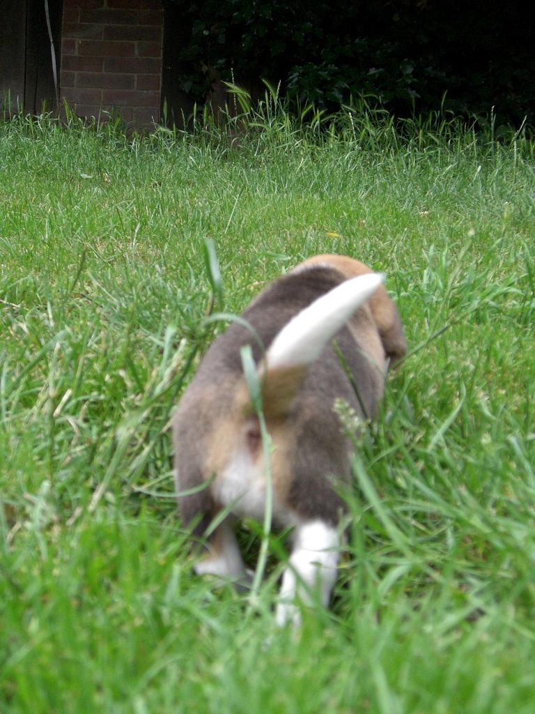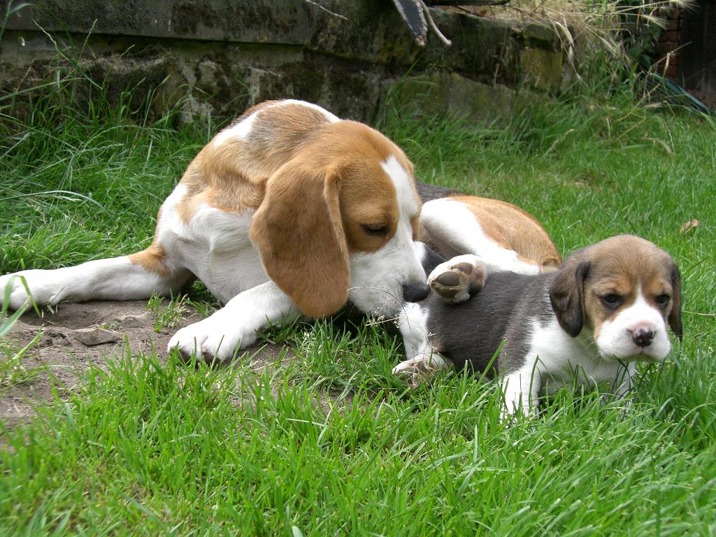 Jetzt - 4 Wochen alt - sind sie auch schon mal bei Sonnenschein im grünen Gras und erkunden die grosse Welt des Hundegartens - bewacht vor allem von Floribel !