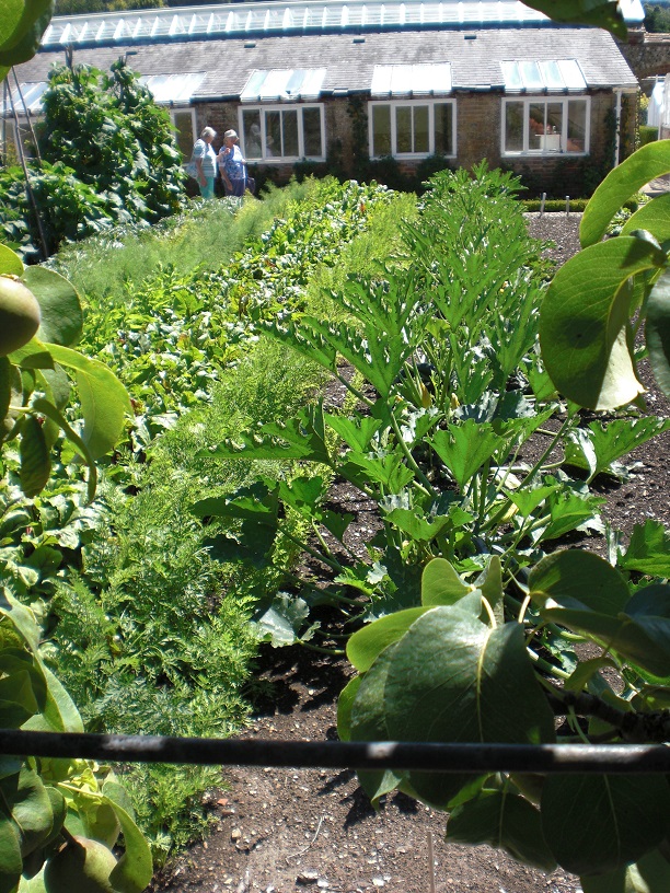 . An der einen Seite von Haus, an 2 Seiten von warmen Backsteinmauern begrenzt, herrscht dort ein ganz eigenes Mikroklima. Der Garten steigt vom Haus her an, rechts und links des Mittelweges die spiegelgleichen Doppelbeete