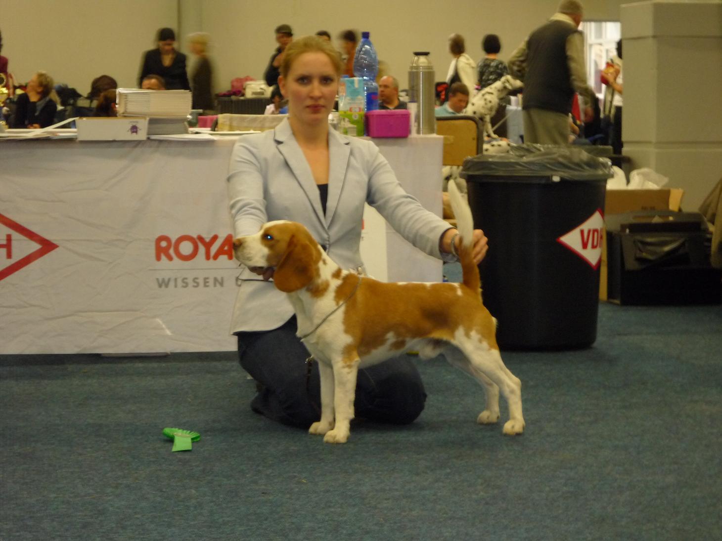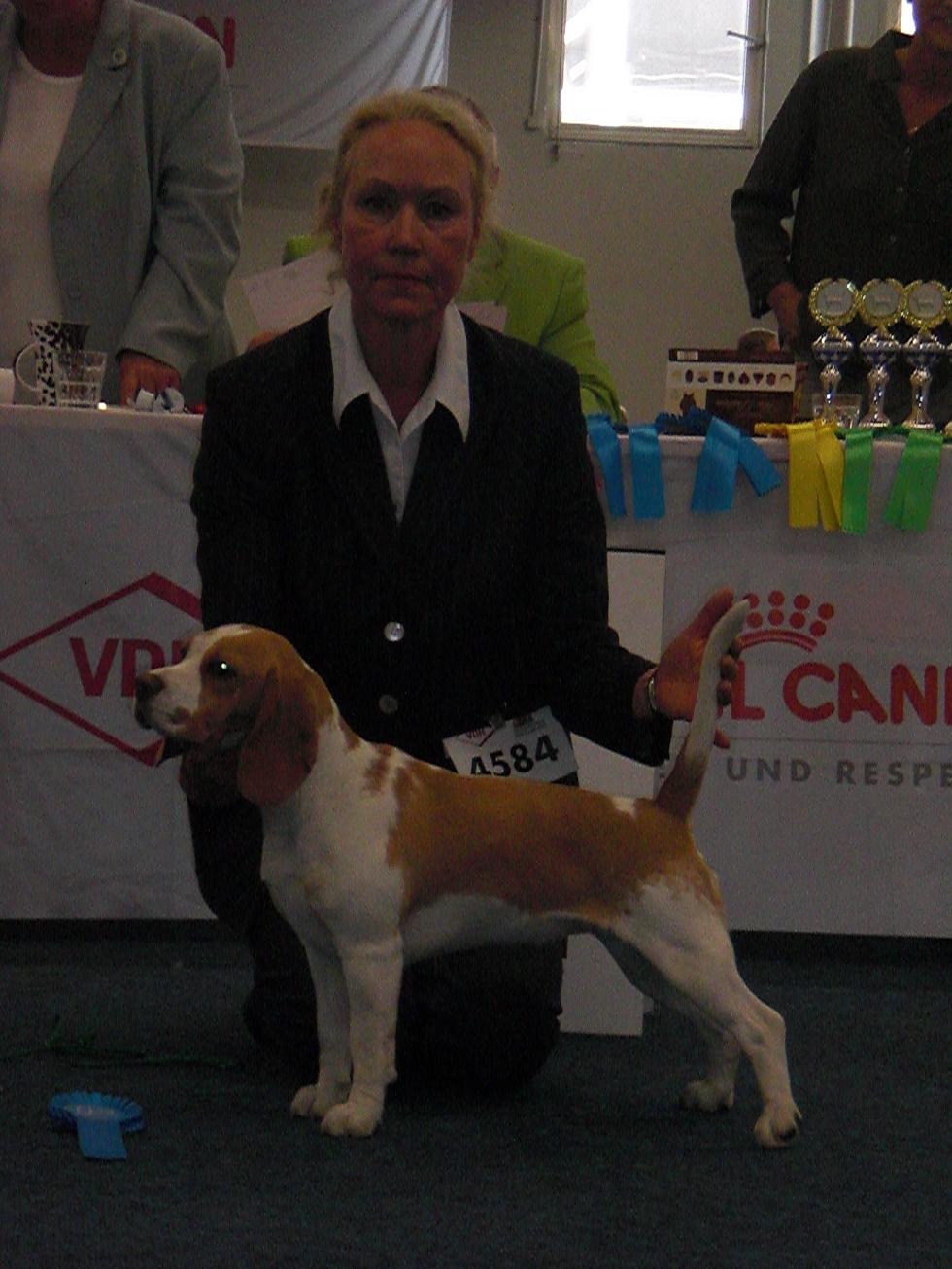 Sechs Interim’s Beagle waren gemeldet und alle sechs bekamen unter der erfahrenen und strengen Richterin Karin Sonntag ein Vorzüglich. Dabei gab es für Brady, Daphne und Bluebelle jeweils ein V1, Heather wurde nach knapper Entscheidung zweitplaziert hinter der sehr schönen Ophelia vom Swister Türmchen, Fulton erreichte ein V4 (… noch etwas jugendlich) und ganz besonders hat es mich für Interim’s Sir Emmet Edwards (Winona x Charlie “Uxley”), der mit seinem Besitzer Herrn Brücher das erste Mal auf einer Ausstellung war und so toll abgeschnitten hat.