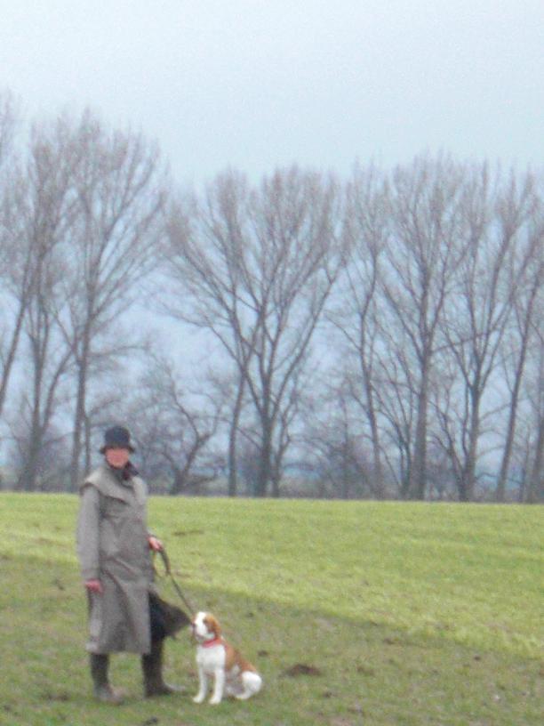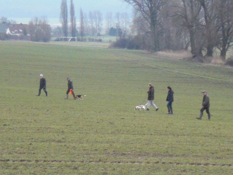 Nachdem im letzten Jahr die Hunde in dem leicht welligen Gelände schlecht zu sehen ( über der Kuppe, aus den Augen… ) und demzufolge schwierig wieder einzufangen waren, hatten wir unsere hundeerfahrene Suita mitgebracht - siehe auch die Videos unter “Schneespass”. Aus dem Sattel hat man den besseren Überblick und schneller ist man auch ! Trotzdem verschwand der Rüde von Herrn David für viel zu lange Zeit und wurde von Herrn Ohlms dann aber in einem Garten wieder eingefangen und seinem Führer zurückgebracht. Alle anderen Hunde konnten schnell mit und ohne Unterstützung von Suita wieder angeleint werden. Als erstes kann die Schussfestigkeitsprüfung für Higgins, Jenkins und Erol - ohne Probleme. Erster am Hasen war Interim’s Sir Jamie Jenkins, von Besitzer Herrn Uebersohn geführt, zu hören: 97 Punkte und einen I. Preis gab es dafür- herzlichen Glückwunsch ! Der jagderfahrene Erol v.d.Emswiese legte mit 100 Punkten nach und wurde Tagessieger. Mit vielen guten Tipps der stets bemühten Richter konnten auch die Hündinnen von Frau Seidendorf, Alice und Anastasia v.Backumer Tal, mit einem III. Preis bestehen ! Zu unserer gesonderen Freude konnte auch der “englische” Sohn unserer Violet, Nedlaw Juniper mit Hannelore Behrendt mit einem III.Preis bestehen ! Der Pechvogel war Higgins, der bei mir schon am Hasen laut war und in Hamburg von seinem Besitzer, Herrn Dr. Wassermann, regelmässig bei der Fährtenarbeit bravouröse Leistungen zeigt - ihn interessierte alles, aber nicht die Düfte einer Hasenspur…. wir versuchen es ein anderes Mal, immerhin war seine Schwester von einem Jahr hier Tagessiegerin !
